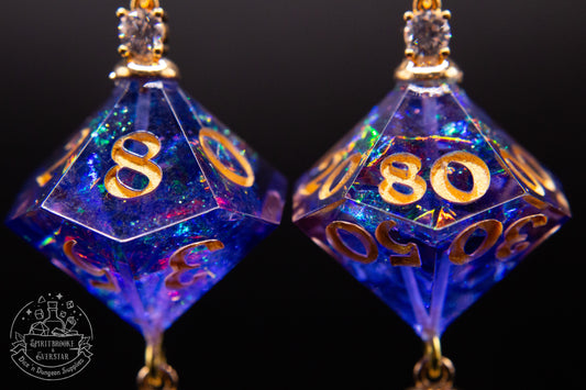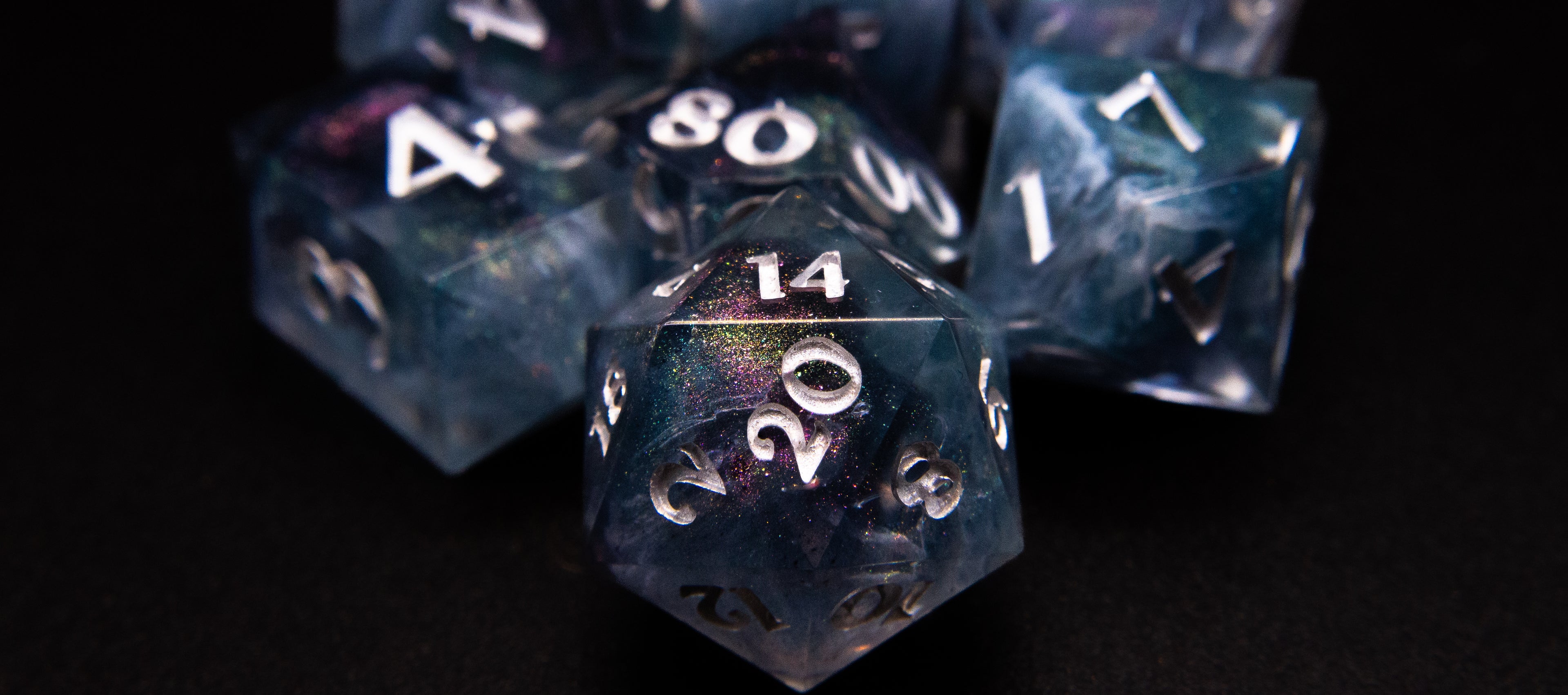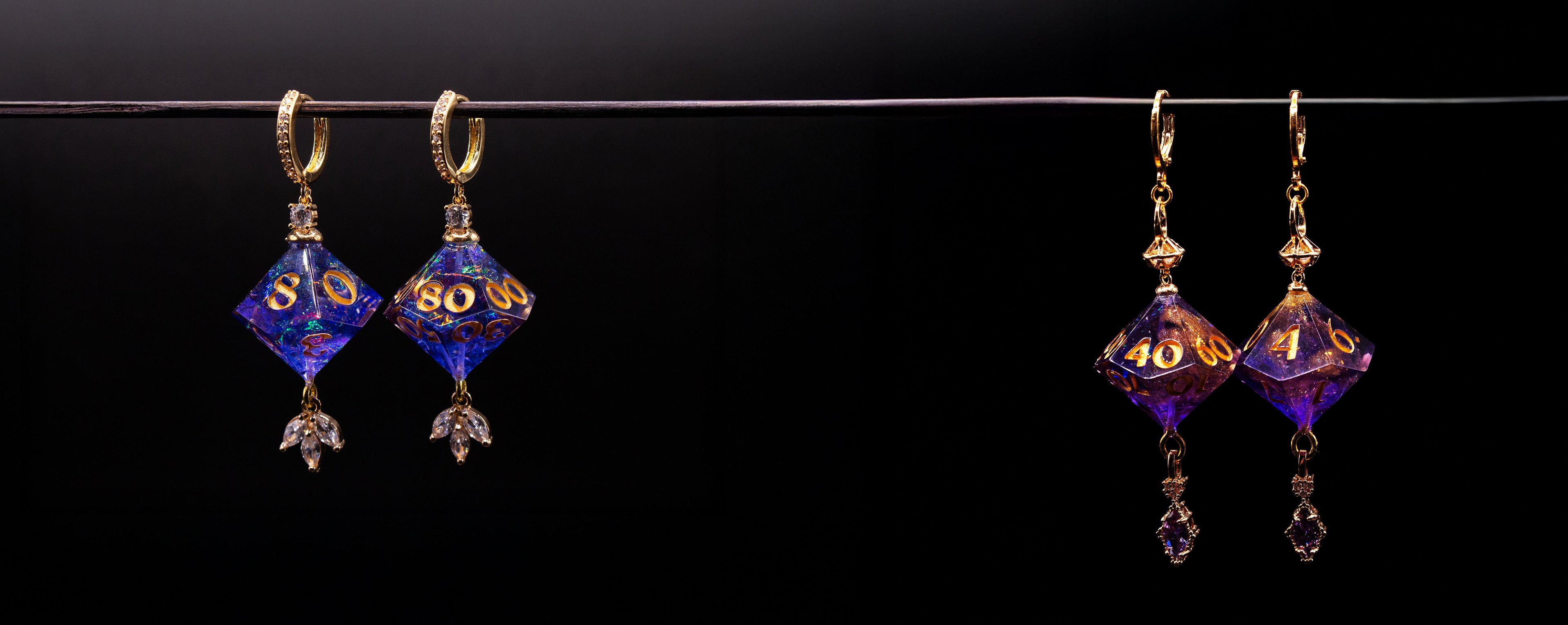 Our goal is to provide you with little works of art that elevate your TTRPG game nights. Every item in our shop is carefully created with a touch of magic and fantasy, resulting in unique products. We're passionate about art, (holographic) shiny things, and aesthetics, which shines through in every piece we offer. On this website you can find fantasy posters (our own design), mugs, dice (sets), dice earrings, dice keychains, dice bags and soon also dice spectacle cords! Everything we make is handmade!