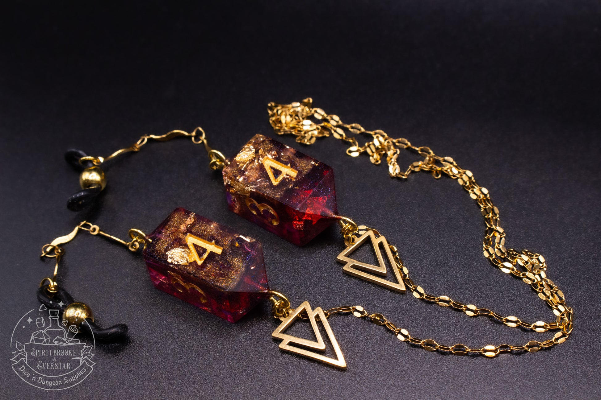 Keep your glasses close and your style bold with our gold eyewear chain featuring handmade resin dice. The warm golden tones pair beautifully with shimmering dice accents, making it a perfect statement piece for fantasy lovers and elegant adventurers alike.