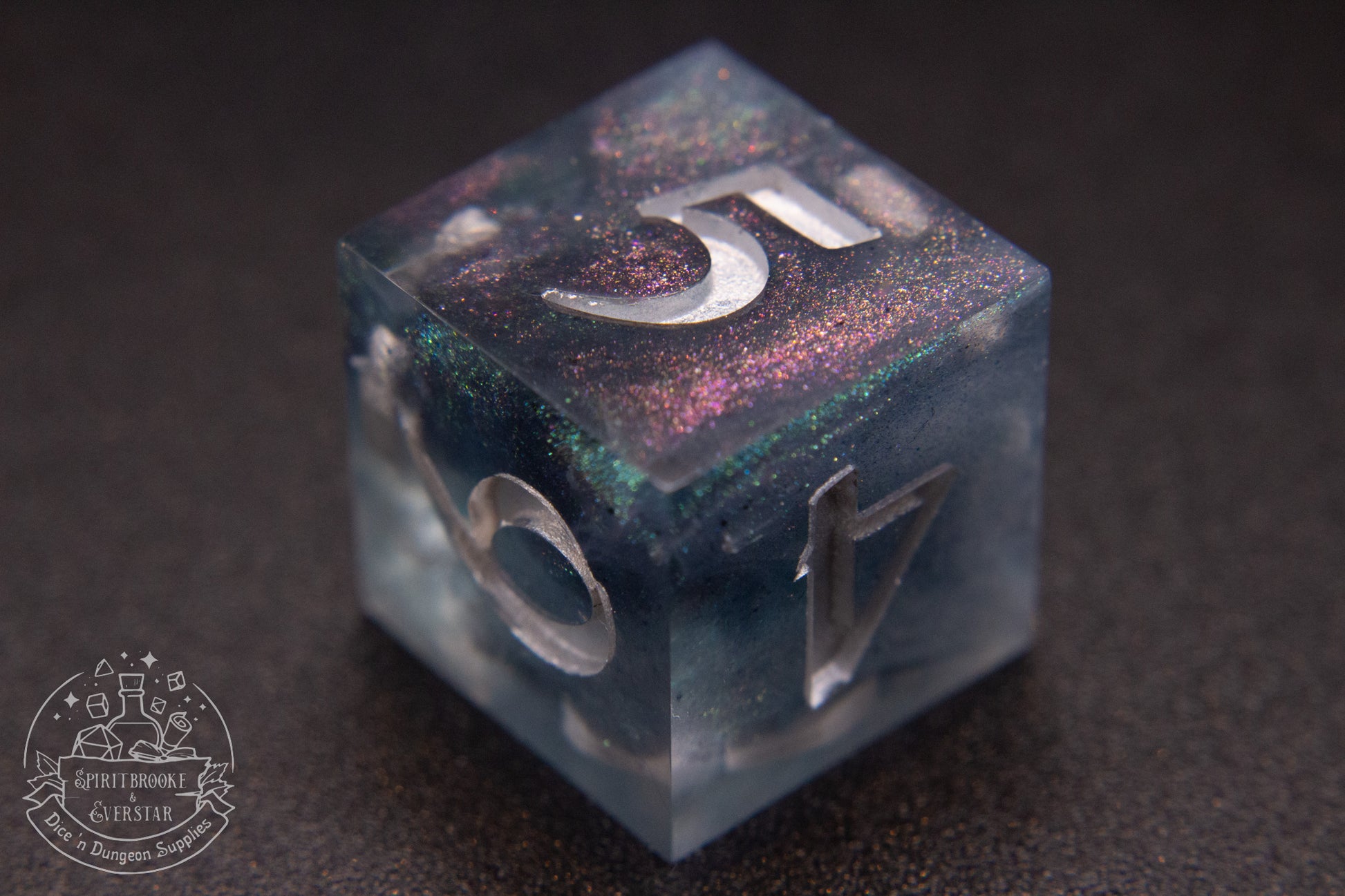 These are handmade and polished polyhedral sharp-edge dice made from resin. It has a misty vibe combined with multichromtic glitter!