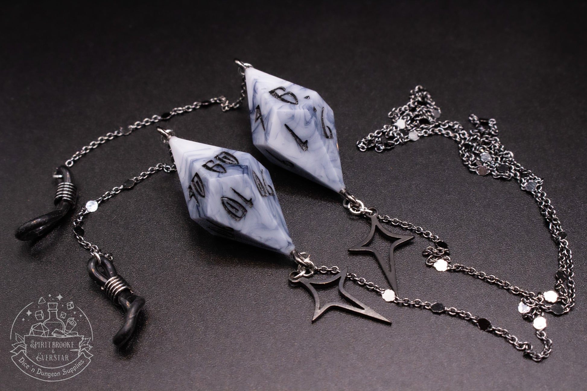Make a bold statement with our black eyewear chain accented by handmade resin dice. The dark tones and shimmering dice create a perfect balance of mystery and style: ideal for fantasy enthusiasts and tabletop adventurers.