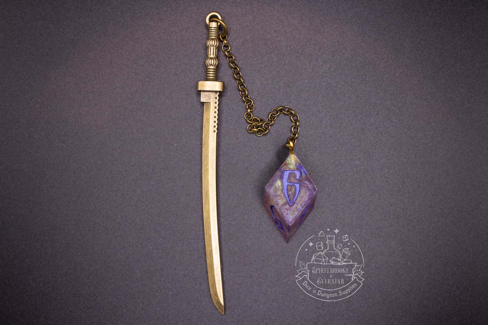Mark your place in epic adventures with this brass and gold bookmark, complete with a dangling dice charm that adds a touch of fantasy magic.