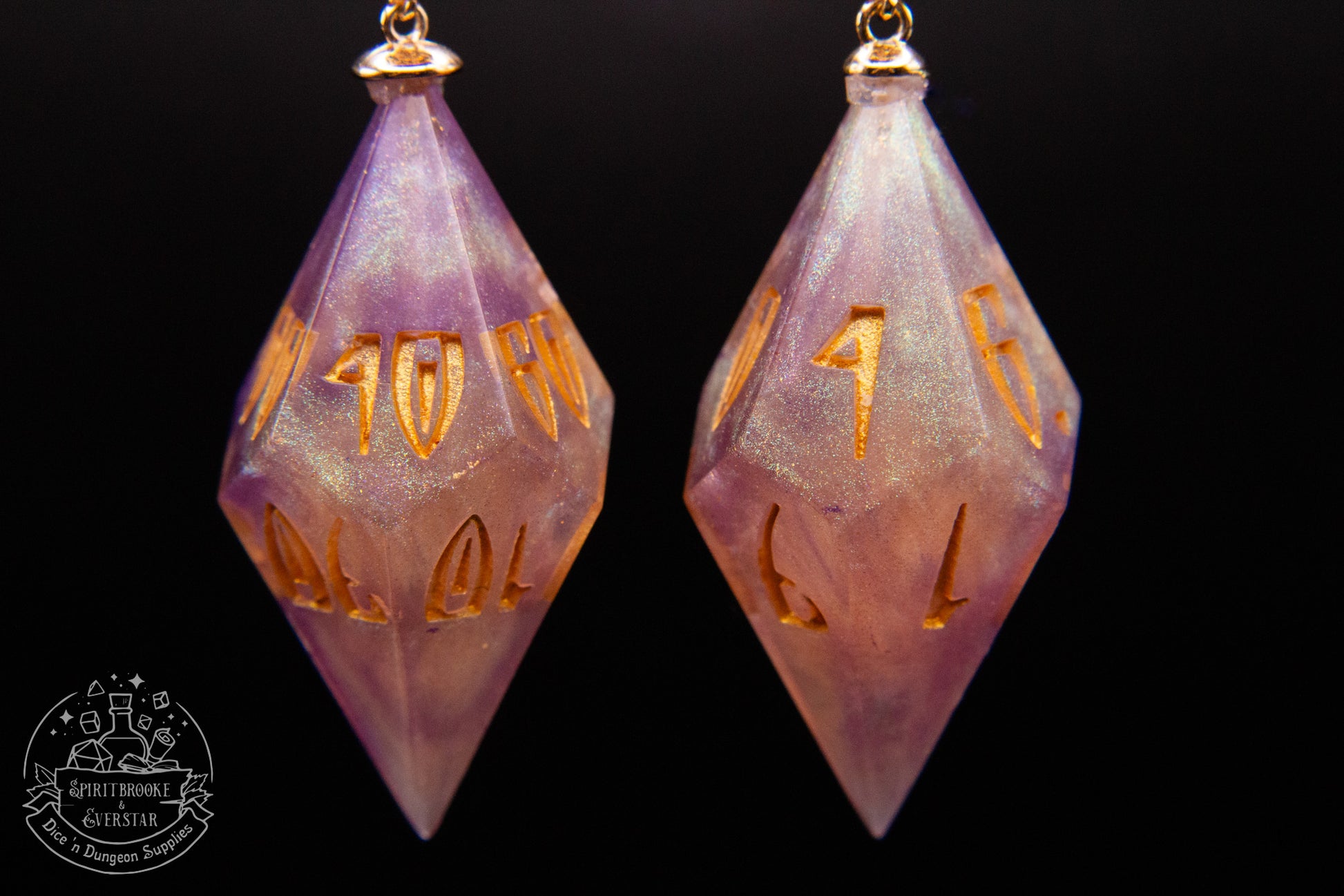 The dice were specifically made to become earrings and are also neatly polished! They would have been perfect dice to play with, but well, they had another destination from the start. Elongated D10 and D100s!