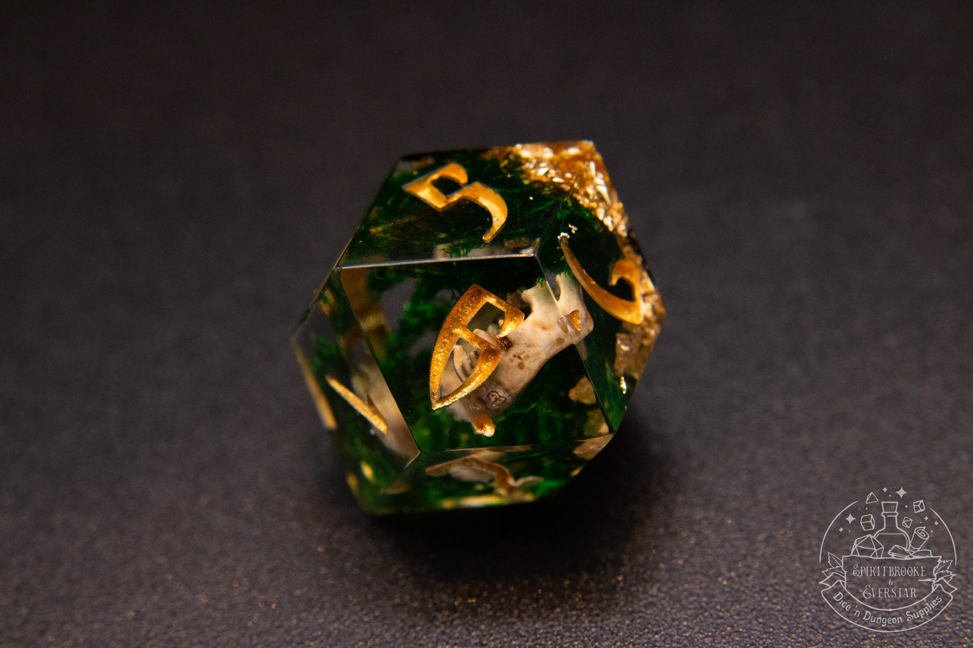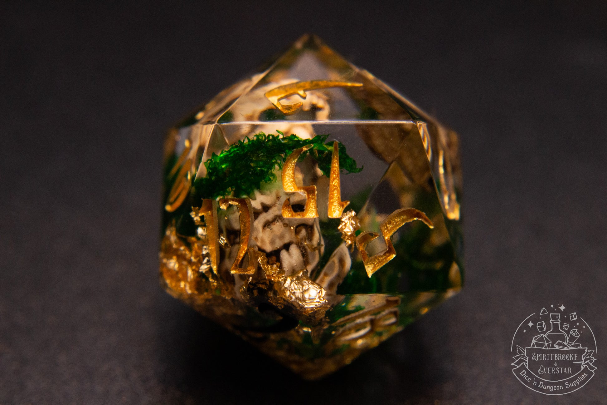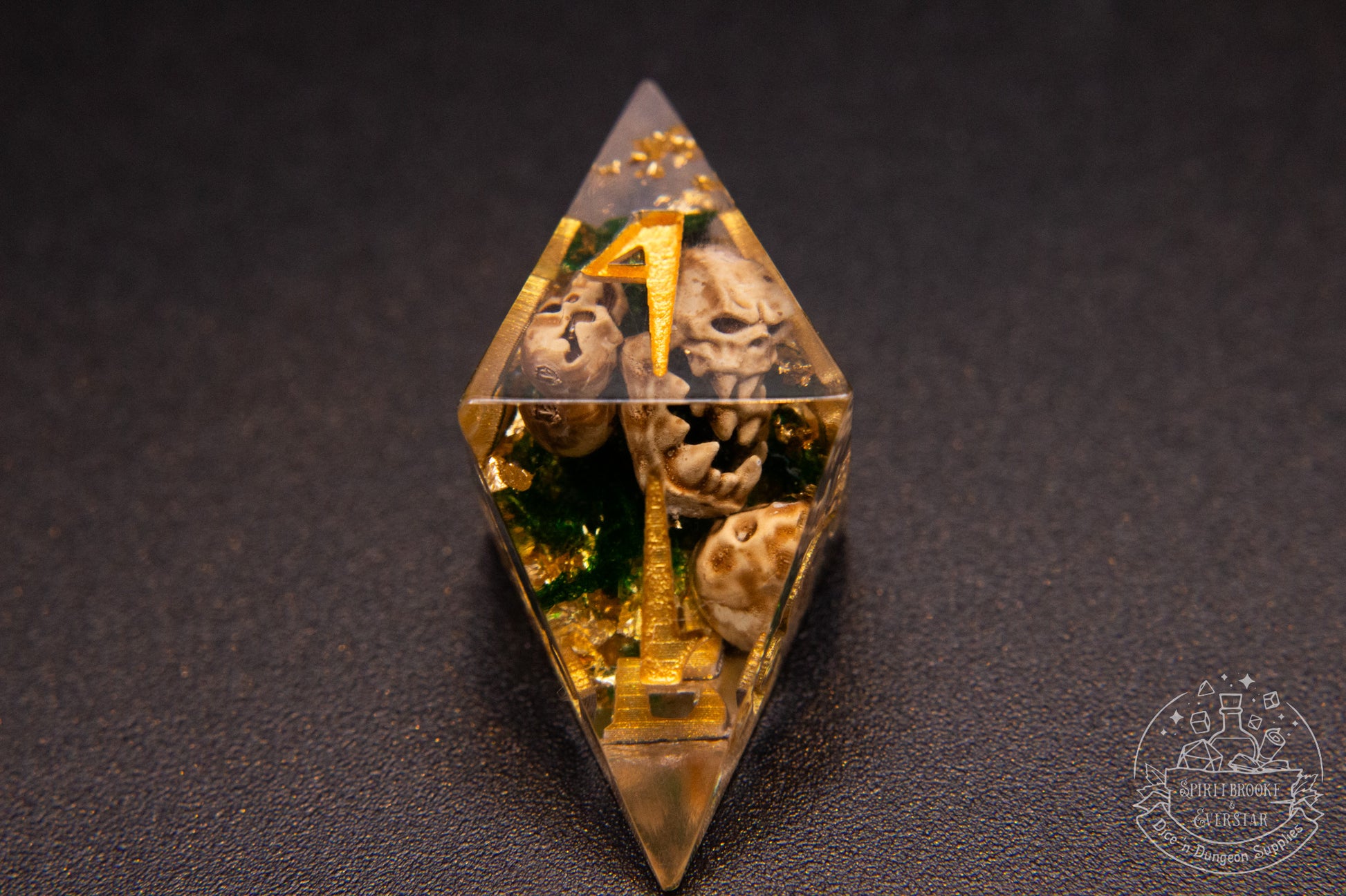 These are handmade and polished polyhedral sharp-edge dice made from resin. It has skulls!