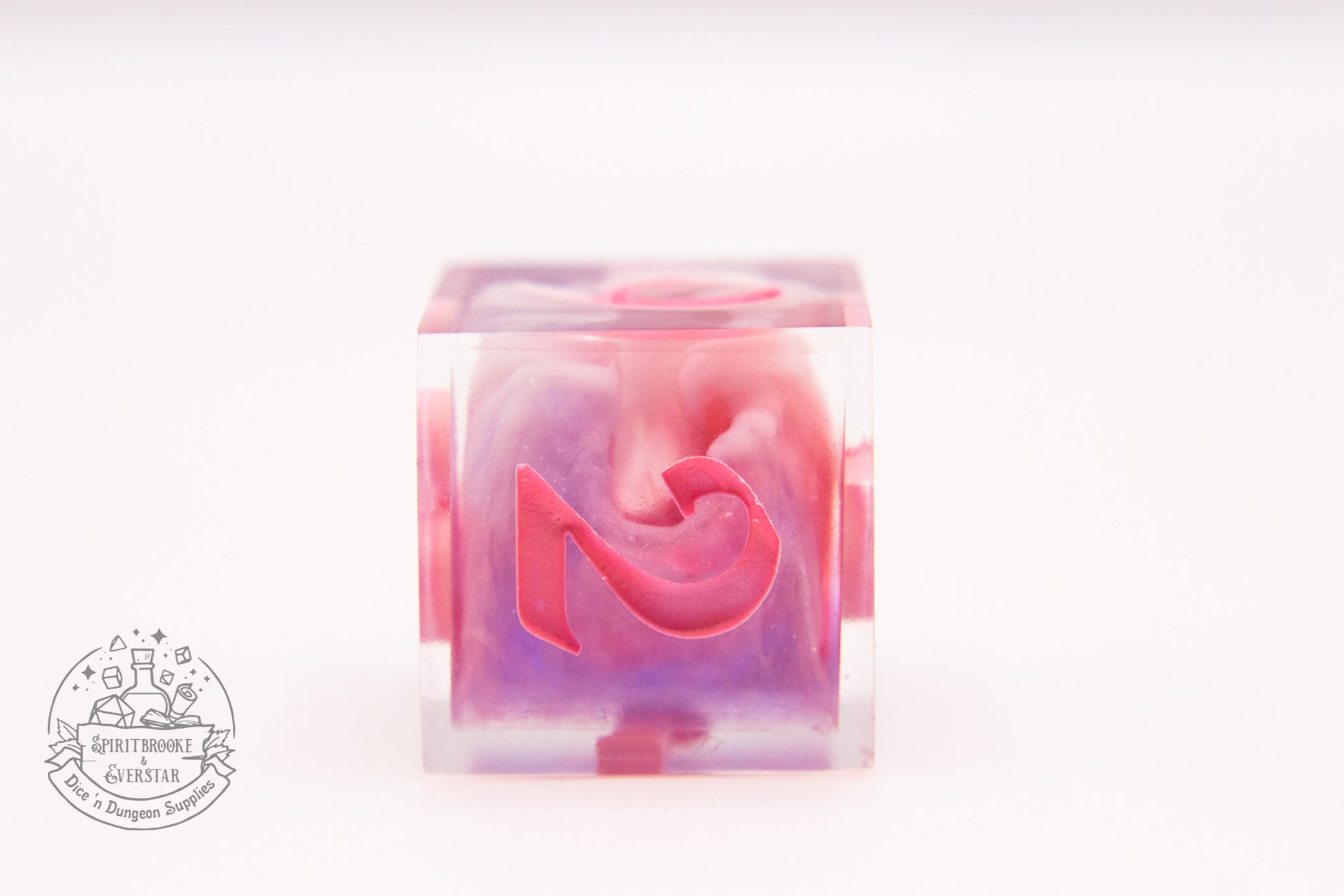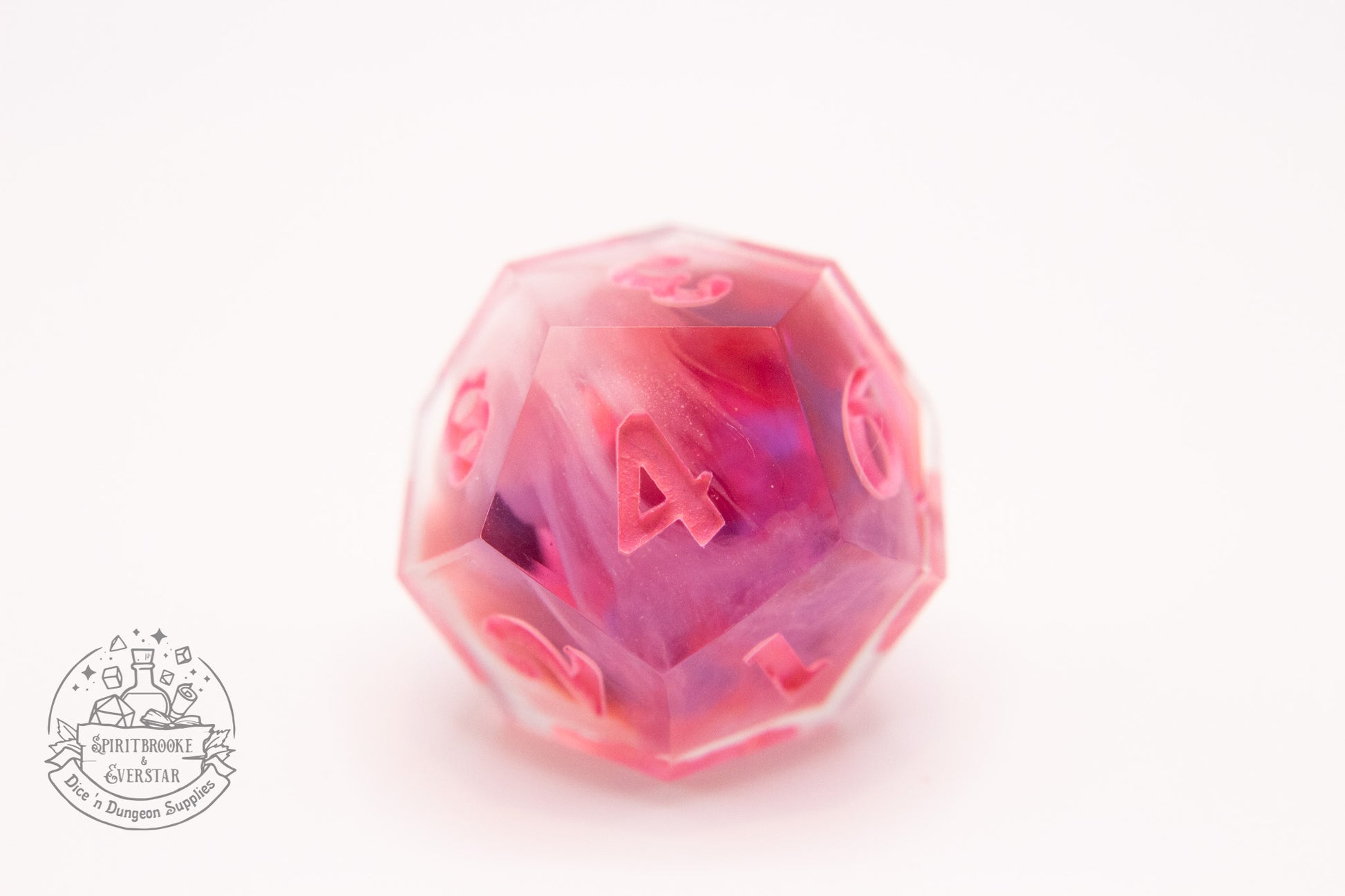 These are handmade and polished polyhedral sharp-edge dice made from resin. This set was made with multiple colors of resin ink and a blob of white glitter and iridescent glitter.