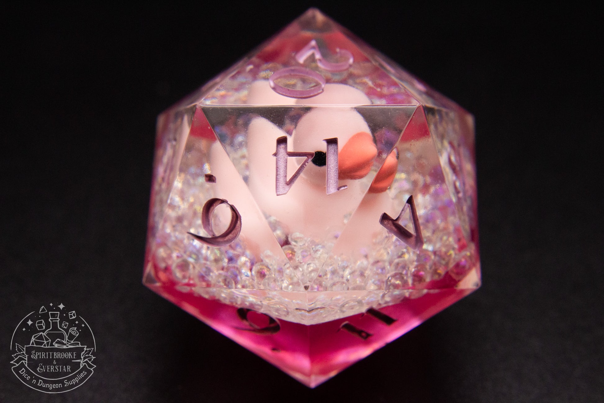 This oversized 35mm D20 features a fun pink ducky floating in pink "water" surrounded by bubbles. Perfect for rubber duck loving people.