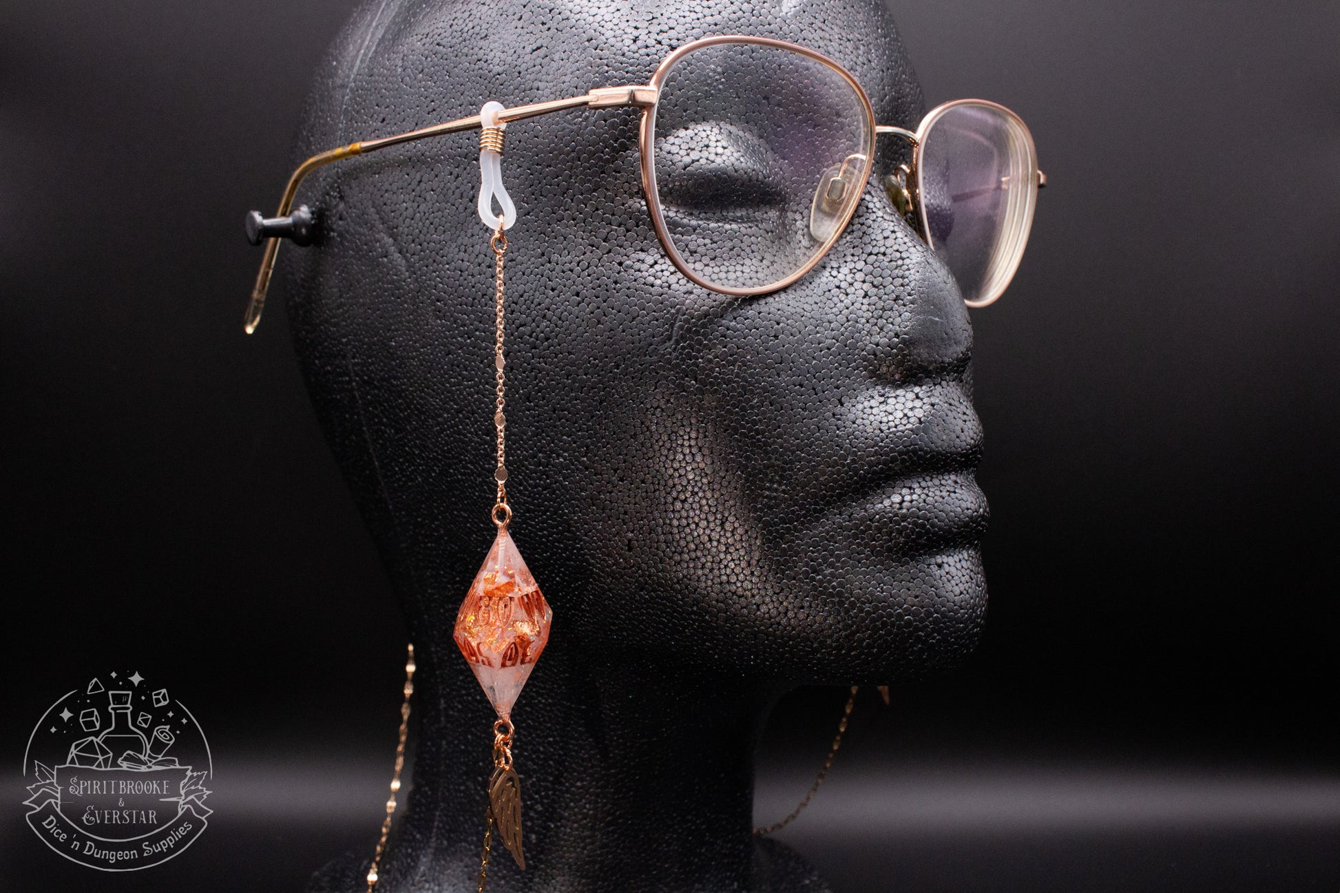 Bring a soft, magical glow to your look with our rose gold eyewear chain featuring handcrafted resin dice. Perfect for dreamers and gamers alike, this delicate chain blends elegance and fantasy charm in one unique accessory.