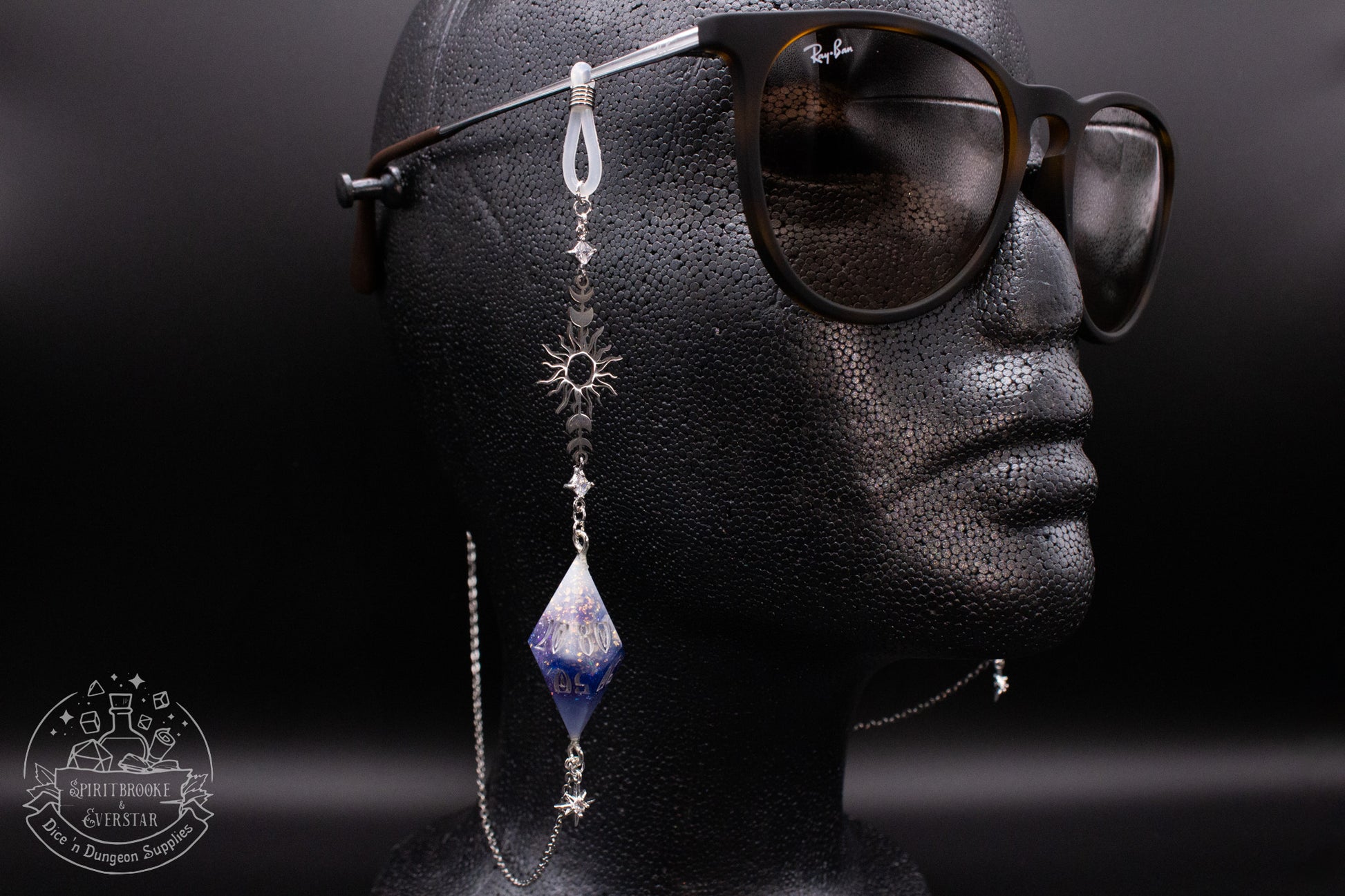 Add a touch of classic fantasy to your everyday look with our silver eyewear chain adorned with handmade resin dice. Perfect for dreamers and gamers alike, this delicate chain blends elegance and fantasy charm in one unique accessory.