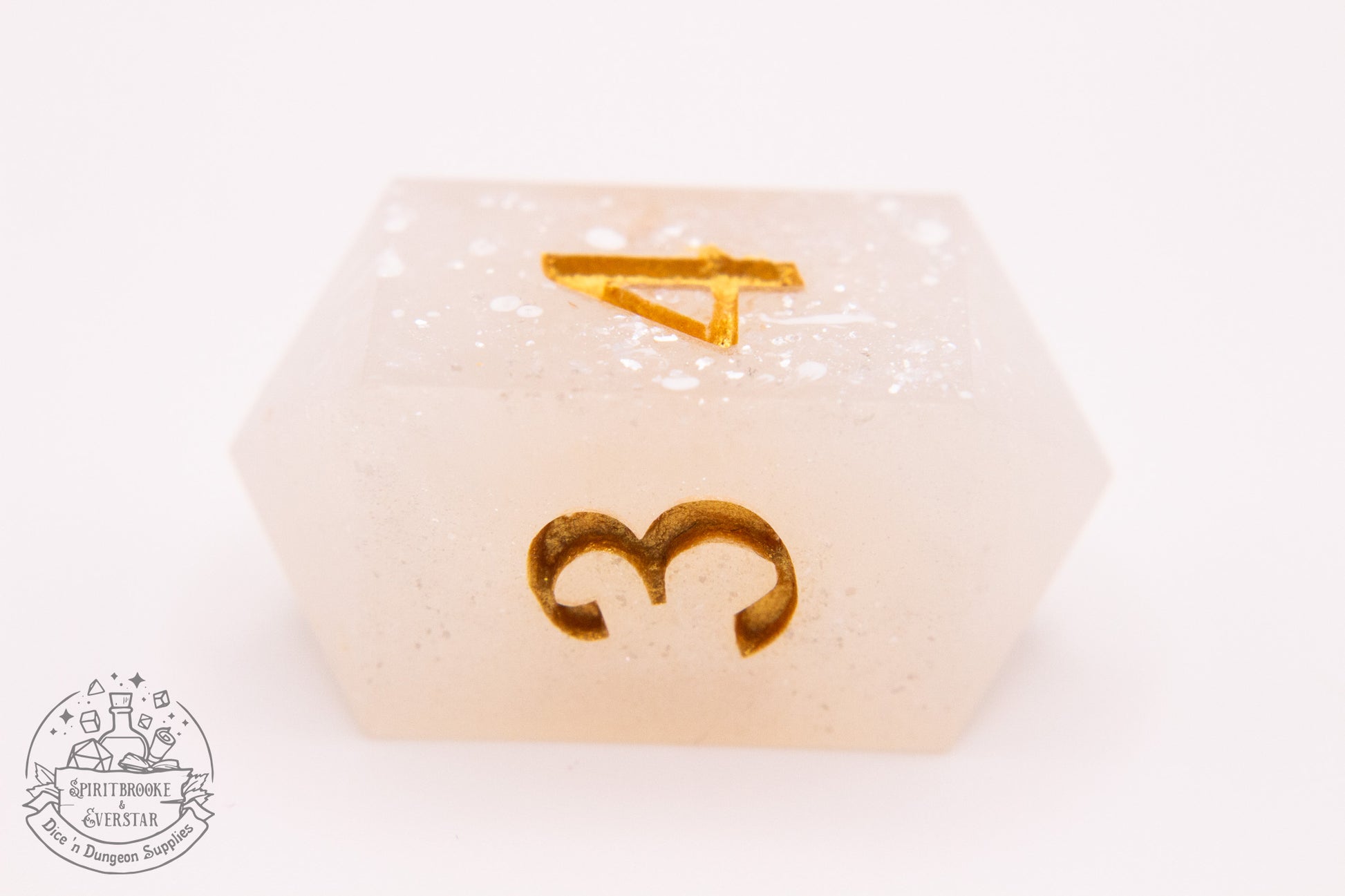 Dice consist mostly of RESION resin, and numbers are inked with acrylic paint.